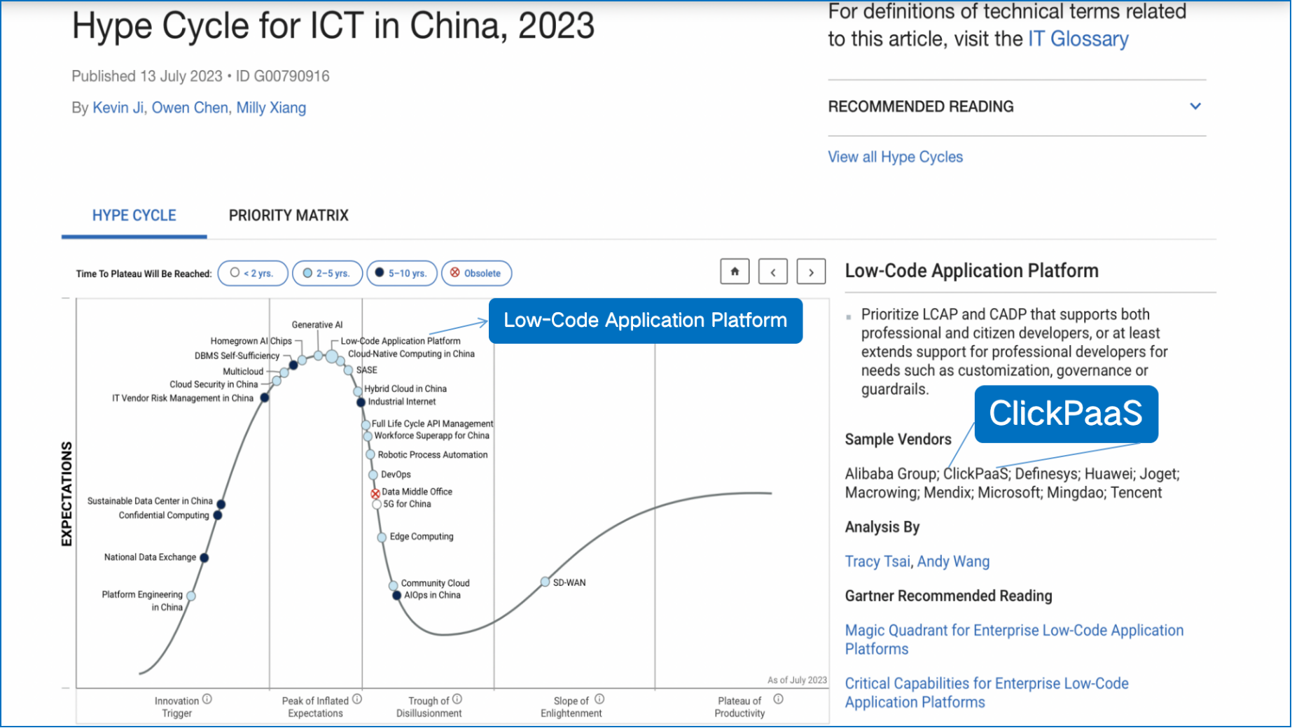 近日,国际权威研究机构Gartner发布了《Hype Cyple for ICT in China,2023(2023年中国ICT技术成熟度曲线)》报告,ng28电子游戏官网入口凭借平台的aPaaS+iPaaS+DaaS保障业务系统的一站式设计,多租户、热发布、国际化、信创安全等特性实力登榜,并作为低代码PaaS平台代表厂商TOP2入选本次报告。